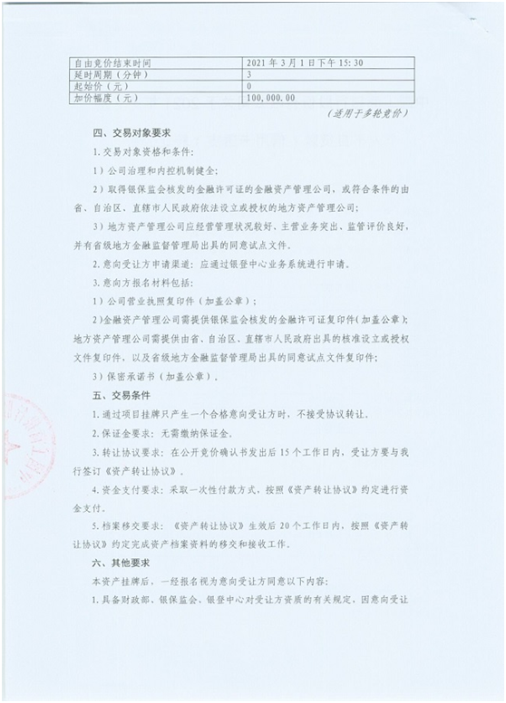 2月8日,平安銀行和工商銀行分別在銀登網上發布了其首個個人不良貸款轉讓公告。兩家銀行不約而同的選在了3月1日采用多輪競價的方式進行競價轉讓,并按《信息披露細則》的規定和附件1《不良貸款轉讓公告》模板,在公告中披露了不良貸款基本信息。