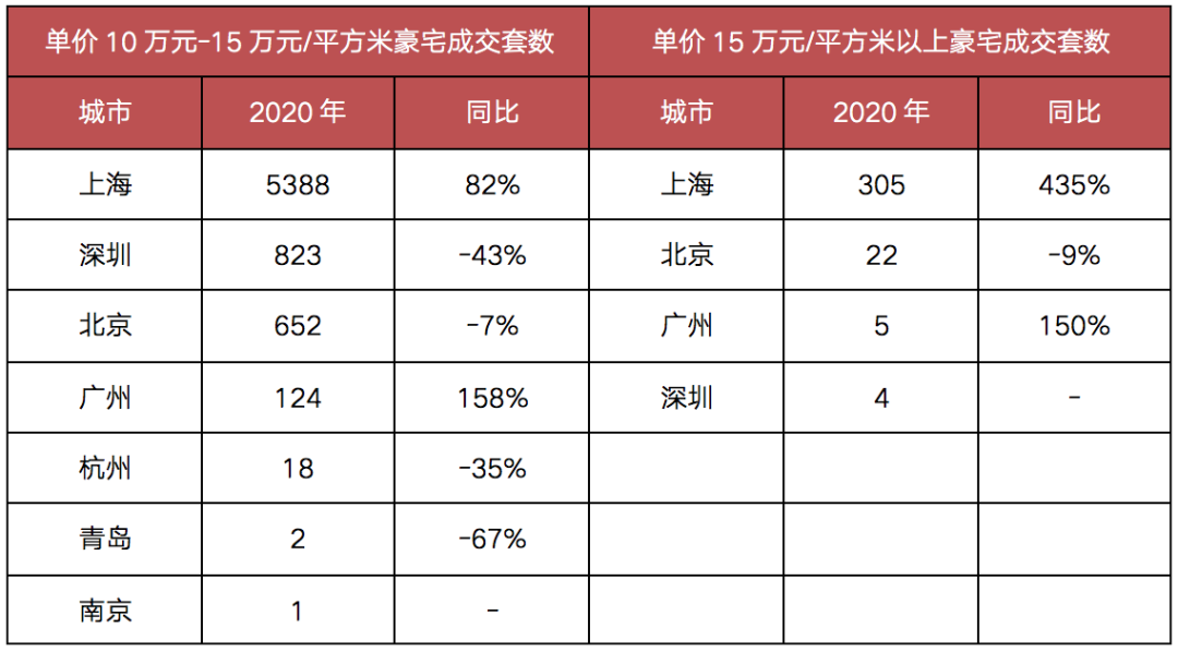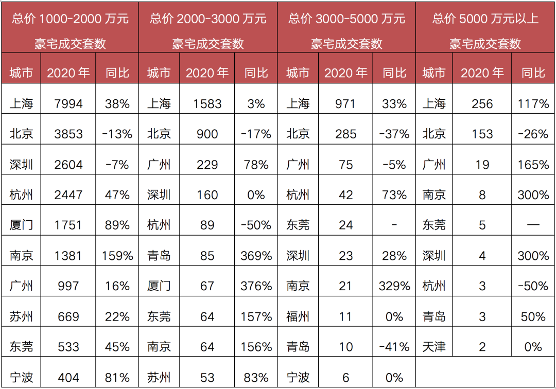 從總價(jià)來(lái)看,5000萬(wàn)元以上豪宅,上海2020年共成交256套,高于排名第二的北京100多套,總價(jià)3000-5000萬(wàn)元豪宅成交上海約為其他所有成交的2倍,其他總價(jià)1000-3000萬(wàn)的豪宅成交來(lái)看,上海也在全國(guó)保持遙遙領(lǐng)先。