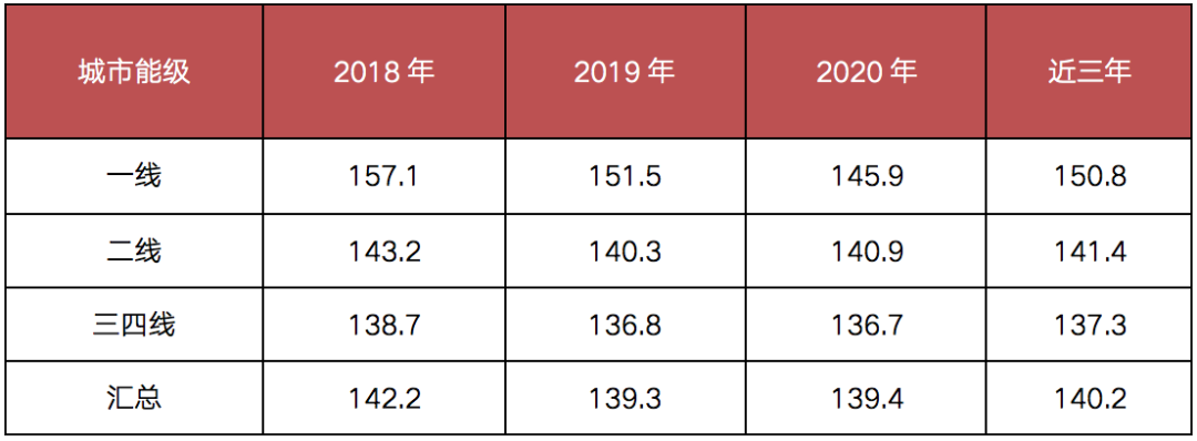 表:各能級(jí)城市四房戶型近三年套均面積情況