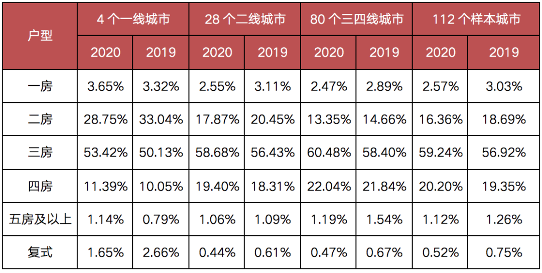 據(jù)112個(gè)重點(diǎn)監(jiān)測(cè)城市的調(diào)查數(shù)據(jù)顯示,2020年,普通住宅戶型成交方面三房仍是成交主力,成交占比進(jìn)一步提升至59.24%,較2019年凈增長(zhǎng)2.31個(gè)百分點(diǎn);與此同時(shí),四房成交占比穩(wěn)中有升,較2019年凈增長(zhǎng)0.85個(gè)百分點(diǎn)至20.2%,高于一房和二房戶型之和,這一數(shù)據(jù)顯示改善型住房需求依舊堅(jiān)挺,且從其上升趨勢(shì)來(lái)看,有較強(qiáng)購(gòu)買力及市場(chǎng)支撐。