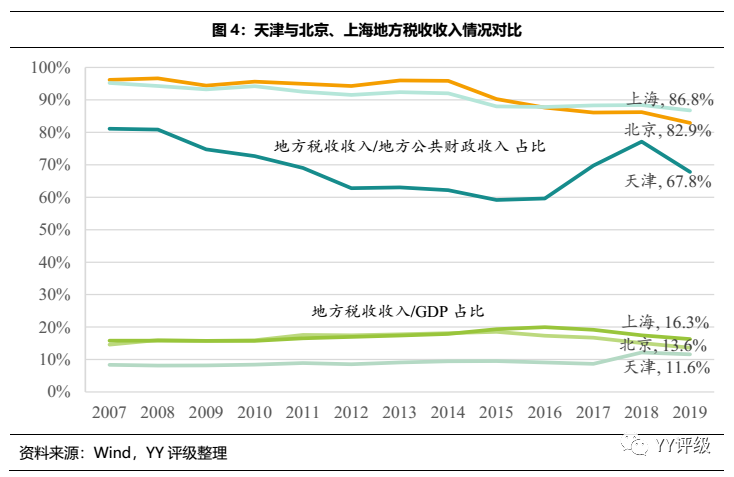 基建開發(fā)如火如荼帶來(lái)債務(wù)規(guī)模的擴(kuò)張,2019年末天津市地方政府債券余額為9,433億元,此為顯性債務(wù);區(qū)域內(nèi)城投債券余額為4,486億元,此為隱性債務(wù)的一部分。此前,YY團(tuán)隊(duì)曾分別采用負(fù)債端和資產(chǎn)端資金來(lái)源兩種方法對(duì)省級(jí)單位的隱性債務(wù)進(jìn)行了測(cè)算,負(fù)債端測(cè)算得到天津2018年末隱性債務(wù)余額為1.878萬(wàn)億元,資產(chǎn)端測(cè)算得到1.702萬(wàn)億元。以債務(wù)率指標(biāo)對(duì)全國(guó)31個(gè)省級(jí)單位進(jìn)行橫向?qū)Ρ龋旖虻膮^(qū)域債務(wù)總額/公共財(cái)政收入比率為391%,相對(duì)債務(wù)壓力排名靠前。
