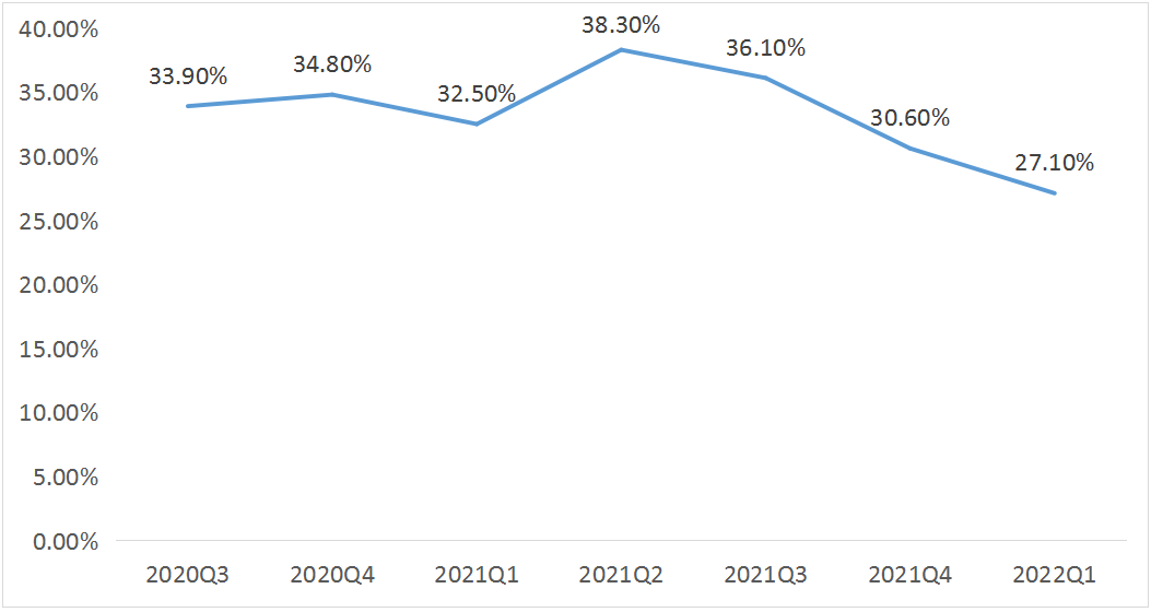 2022年一季度A股公司實現收入164936.38億元,實現凈利潤15157.24億元。A股上市公司一季度收入增速10.97%,與疫情前的增速相當;一季度營業利潤增速3.09%,低于疫情前的水平。