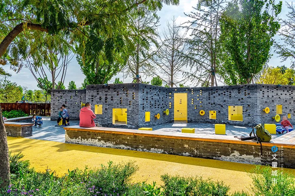 灰磚和暖黃鋪裝在色彩上碰撞融合,剛硬的底色上傳達出了溫暖和樂觀的感覺,也與公園內的法桐樹、銀杏樹遙相呼應,深秋葉黃,必是一番好景致。穿孔灰色墻磚又與穿孔耐候鋼、不銹鋼雕塑交替組合,則在構件上實現了傳統與現代交融的層次感。