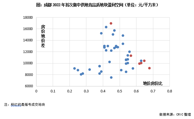 即使進入搖號環節的幾宗地塊,房價地價差也在1萬元/平方米左右,其中中瑞天悅競得的武侯區純住宅地塊成交樓板價為13600元/平方米,但銷售限價達到30500元/平方米,盈利空間相對可觀。