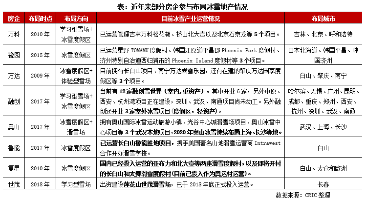 冰雪產業主要包括冰雪服務業、冰雪場地設施建設業以及冰雪用品及相關產品制造業三大類,而房企對冰雪產業的布局集中于冰雪場地的開發運營、冰雪旅游等地產領域。