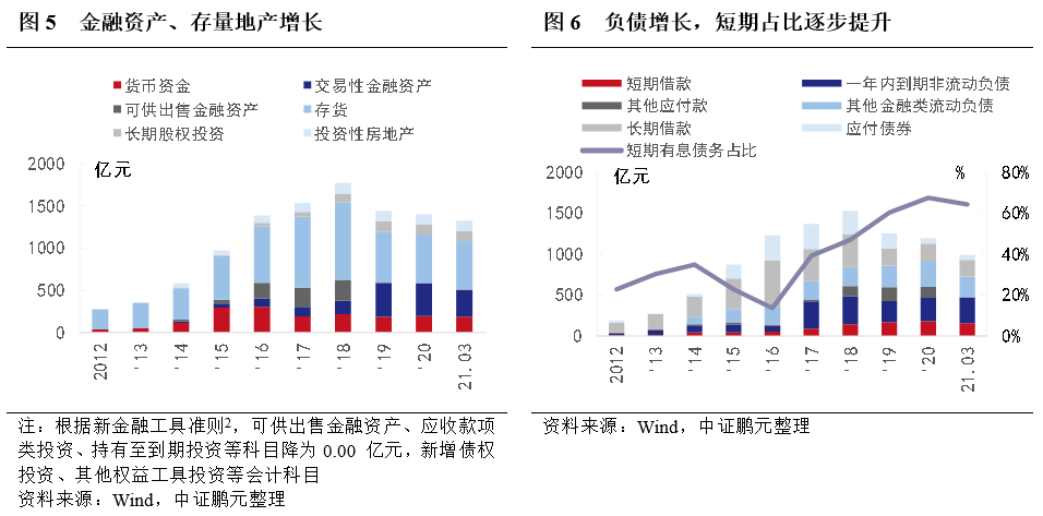 地產和金融不分家的邏輯,在泛海系中延伸。隨著收購的推進,泛海系打造了民生系金融家族,并在其中占有主導地位。轉型完成了第一階段的業務布局,進入第二階段的現金流綜合管理,逐步出現轉型中的“陣痛”。第一,地產板塊停止擴張,但存續項目后續投資規模較大。公司地產板塊土地資產主要為2016年之前獲得,此后以釋放存量土地價值為主。隨著地產項目建設投資的推進,存貨規模大幅增長,在資產中占比逐年增加,截至2018年3月,存貨占比63%,在建項目計劃總投資821.78億元,尚需投資343.94億元,再融資壓力較大。第二,布局金融業務,帶來金融資產增長。通過收購(增資)亞太財險、民生期貨、民生證券和民生信托等板塊布局民生系,可供出售金融資產2015年、2016年出現大幅增長,交易性金融資產隨金融板塊業務的發展而增長,但業務受制于資管新規影響,金融業務板塊收入在2018年出現放緩,隨著2019年進一步布局金融業以及市場回暖,金融相關資產占比大幅提升。其中,交易性金融資產主要為子公司民生證券自營業務投資的證券,變現能力整體較好。第三,負債大幅增長,短期債務占比逐步提升,再融資壓力提升。受存量地產業務和金融業務擴張需求影響,2012年后公司負債規模出現明顯增長,其中,2014-2016年受地產項目融資增長影響長期借款占比大幅提升,隨著債務逐步到期,2017年以來短期債務占比逐漸增加,同時,公司長期融資規模出現明顯下降,再融資壓力提升,面臨集中償付風險。