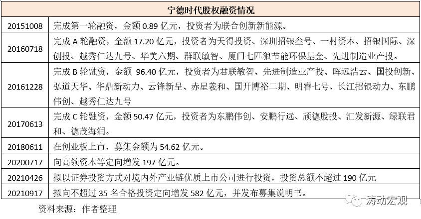 債權融資之外,股權融資是寧德時代比較依賴的融資方式。自2015年以來,寧德時代已經歷IPO之前的四輪融資、IPO募資以及一次定增,目前正在啟動上市后的第二輪定增。