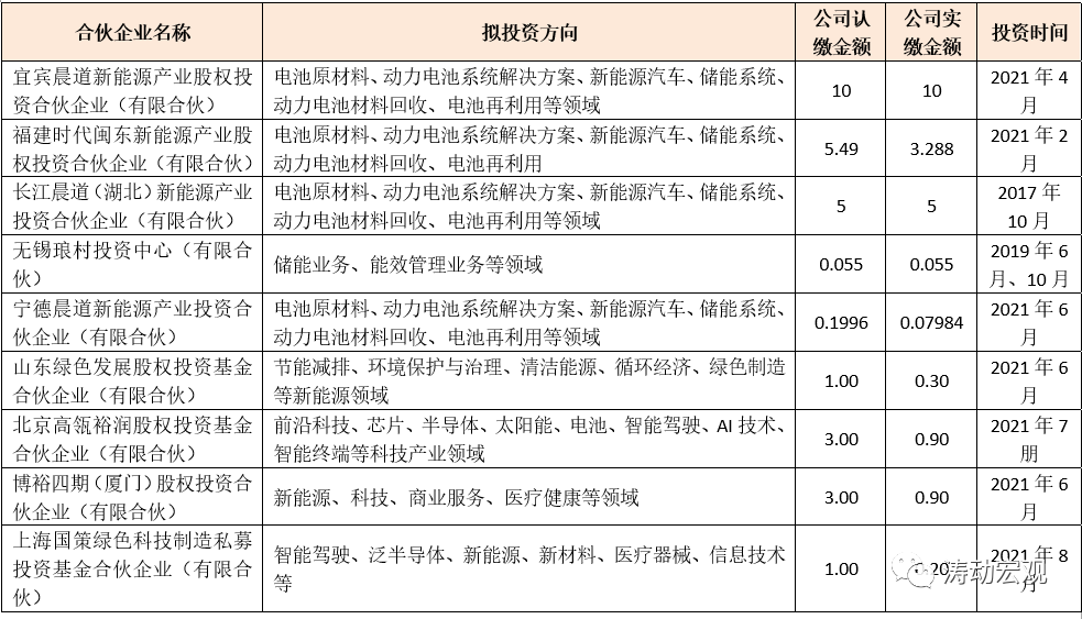 2、此外,2021年10月11日,寧德時代發布公告稱,通過受讓以及參與新設的方式投資珠海隱山現代物流產業股權投資基金(有限合伙)、青島隱山創業投資基金合伙企業(有限合伙)以及廈門隱山股權投資合伙企業(有限合伙),認繳金額分別為0.60億元、2億元及3億元。