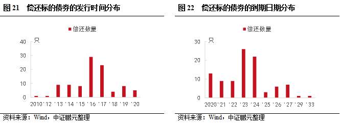 2022年2月,借新還舊企業債發行7只,規模23.37億元,位于單月高位。截至2022年2月,借新還舊企業債共發行67只,發行規模合計318.36億元。其中,2020-2022年分別發行121.39億元、161.60億元、35.37億元。從償還債務類型看,償還2020年到期債券的有45只,發行規模218.19億元,償還2021年到期債券的有22只,發行規模100.17億元。結合發行與償還來看,存在一定時間差,與申報時間有一定關系,若債券發行時,募集資金擬償還債券已用其他資金償還,則可以置換此部分資金。例如,2021年發行的借新還舊債券中,69.7%是用于償還2020年到期債券,2022年已發行的借新還舊債券均用于償還2021年到期債券本息。