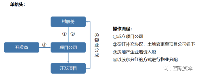 需注意的是,單抬頭的合作模式下,因項目公司分配給村股份公司的物業(yè)無法做稅前扣除,因此在土地成本(如非農(nóng)或征返用地的出讓金)很低的情況下綜合稅負就會高很多,另外開發(fā)商完成項目的開發(fā)建設(shè)并在分配物業(yè)的過程中,因項目公司分配給村股份公司物業(yè)需按視同銷售處理,因此在土地成本很低的情況下相當于開發(fā)商還要額外掏出現(xiàn)金去繳納分配物業(yè)過程中的巨額稅費,由此就催生了雙抬頭的合作模式。