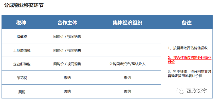 需注意的是,在雙抬頭模式下,對于村股份公司通過分成方式取得物業(yè)的情形,因在分房過程中未發(fā)生產(chǎn)權(quán)轉(zhuǎn)移(村股份公司也持有土地使用權(quán)并一起完成開發(fā)建設(shè)和自始取得房產(chǎn)),因此村股份公司與項目公司均無需繳納增值稅、土地增值稅、企業(yè)所得稅、契稅。對于需對外銷售部分的物業(yè),如由項目公司直接分房后對外銷售,該部分稅金則不需重復(fù)繳納。也正因為上述原因,“雙抬頭”最近幾年已成為深圳這邊村企凈地合作開發(fā)的主流模式。