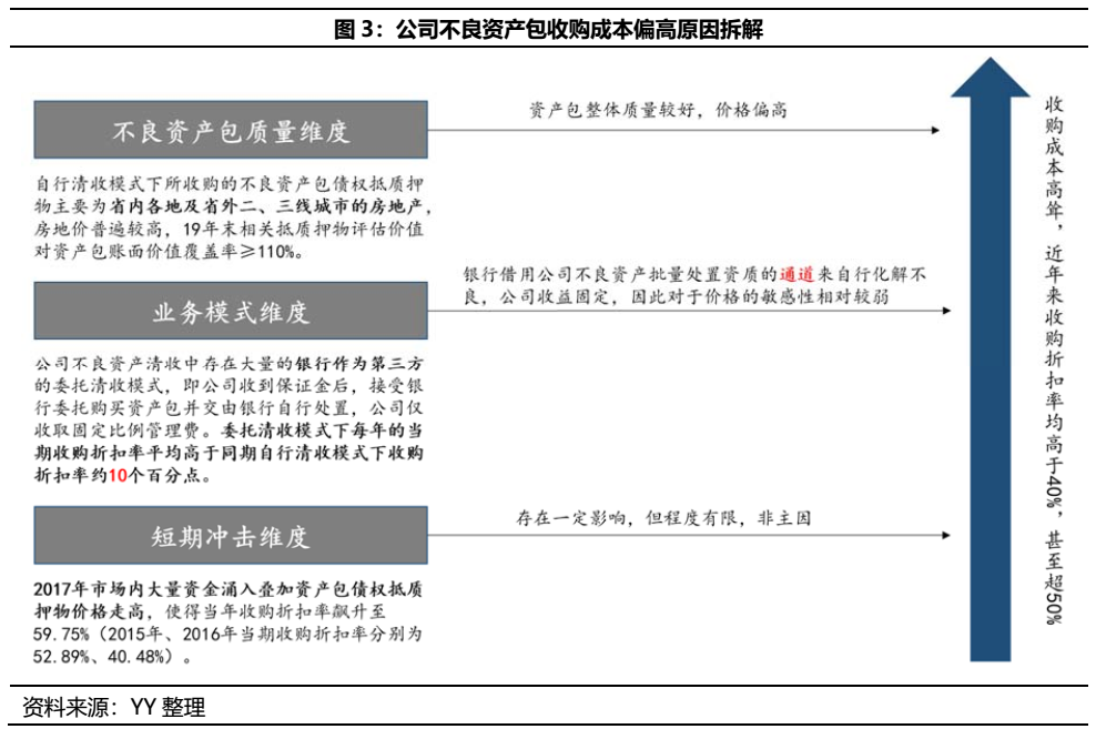 具體來看,銀行作為第三方的情況下,實(shí)際上是借用公司的通道來自行化解不良資產(chǎn),公司定期確認(rèn)部分收入;非銀作為第三方的情況下,實(shí)際上是向其他無不良批量收購資質(zhì)但有業(yè)務(wù)需求的機(jī)構(gòu)提供業(yè)務(wù)來源(如省內(nèi)的浙越資產(chǎn)),公司一次性收取管理費(fèi)。