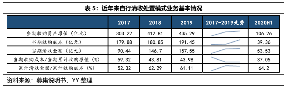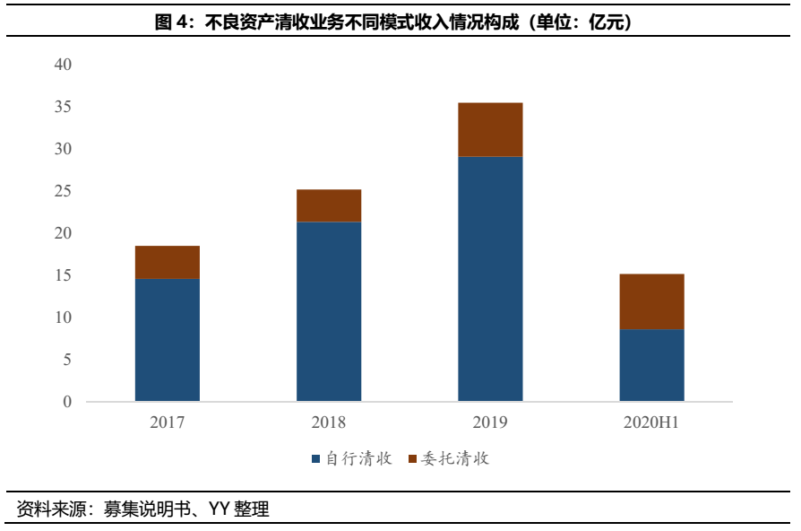 具體業(yè)務(wù)模式上,公司通過自行清收及委托清收兩種模式來實(shí)現(xiàn)不良資產(chǎn)處置,委托清收模式主要是公司成立之初不良資產(chǎn)處置經(jīng)驗(yàn)及能力不足時(shí)用于規(guī)模擴(kuò)張的權(quán)宜之計(jì),目前公司已不再新增委托銀行清收類業(yè)務(wù)(接受其他金融機(jī)構(gòu)委托的模式仍在延續(xù)),對現(xiàn)有存量逐步消化,收益更高的自行清收模式成為主角。