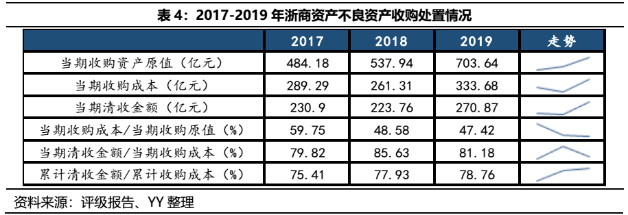 前文已提到,公司所持有的不良債權(quán)包整體質(zhì)量較好,抵質(zhì)押物多為浙江省內(nèi)及省外二三線城市房地產(chǎn),19年末相關(guān)抵質(zhì)押物評估價(jià)值對資產(chǎn)包賬面價(jià)值覆蓋率≥110%。雖然不良資產(chǎn)包的處置期限普遍相對較長,但從前期累計(jì)現(xiàn)金回收率來看(19年末為78.76%),整體處置效率較高,清收期限基本能保證在3年內(nèi)。因此目前來看,核心部分的資產(chǎn)質(zhì)量和相對周轉(zhuǎn)效率有一定保障。