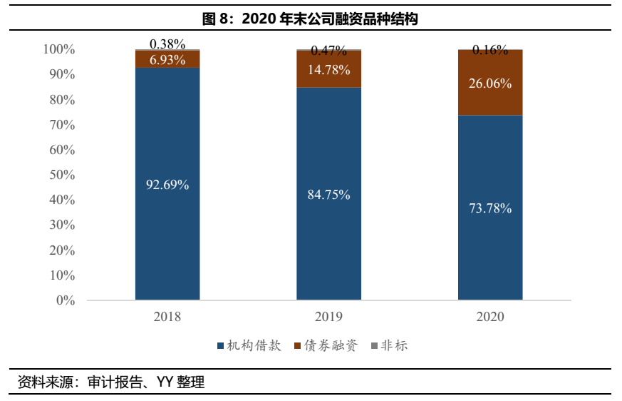 從債務(wù)品種來看,銀行借款仍然是公司最主要的融資來源,近年來債券融資占比有所提高,非標(biāo)融資規(guī)模很小,整體融資結(jié)構(gòu)較健康。