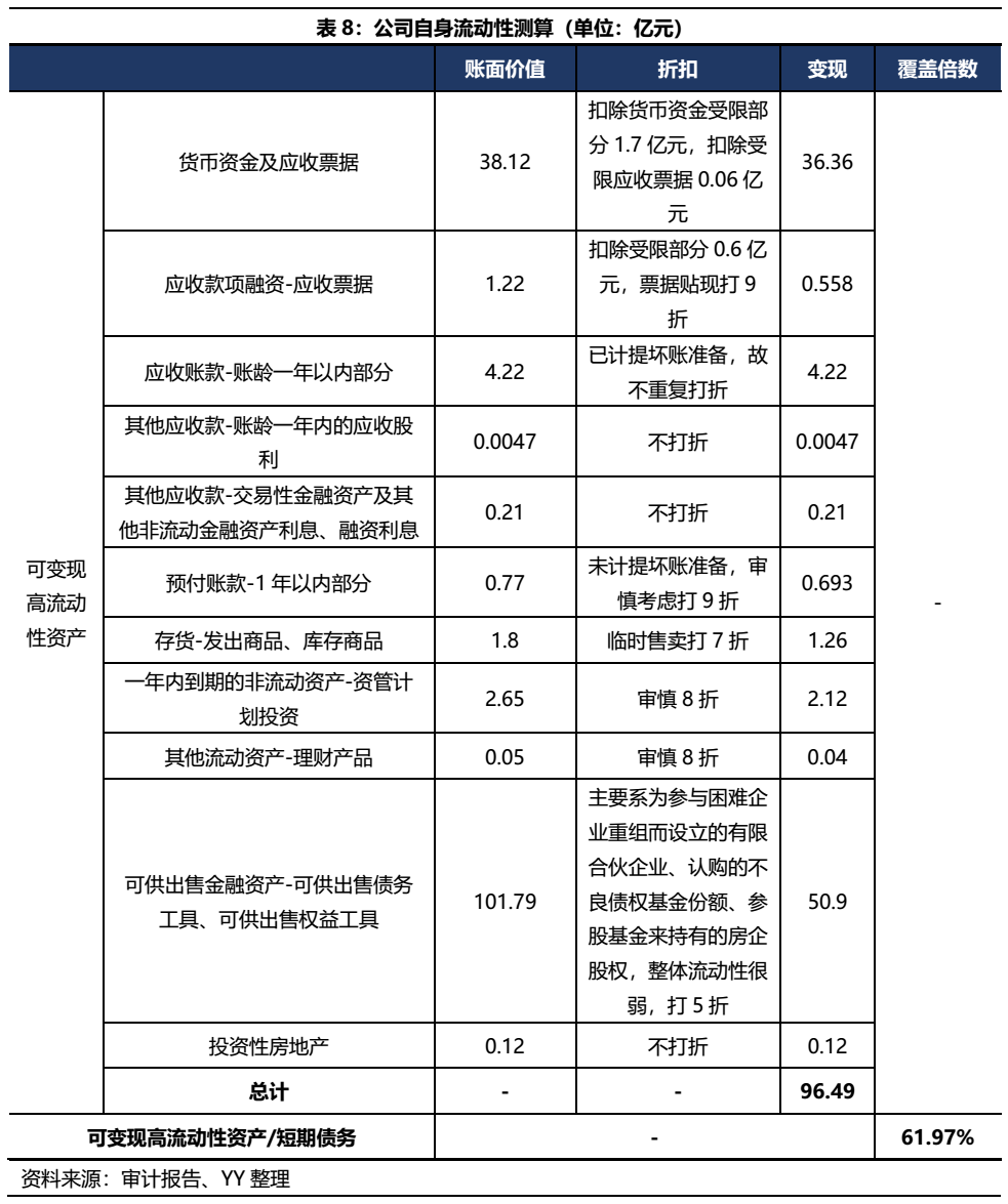 據(jù)測算結(jié)果,極限變現(xiàn)的情況下,公司自身流動(dòng)性對短期債務(wù)的覆蓋程度僅有61.97%,尚存在59.21億元資金缺口有待備用流動(dòng)性即再融資的補(bǔ)足。