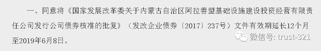 最后也是最關(guān)鍵的,連續(xù)發(fā)債失敗:2017年6月,國家發(fā)改委曾核準阿拉善盟基礎(chǔ)建設(shè)投資經(jīng)營有限公司(項目融資方)發(fā)行17億公司債券:但由于種種原因,這個債券發(fā)行失敗了;2018年6月,該公司向發(fā)改委申請批復有效期延長一年,至2019年6月,并獲得發(fā)改委許可: