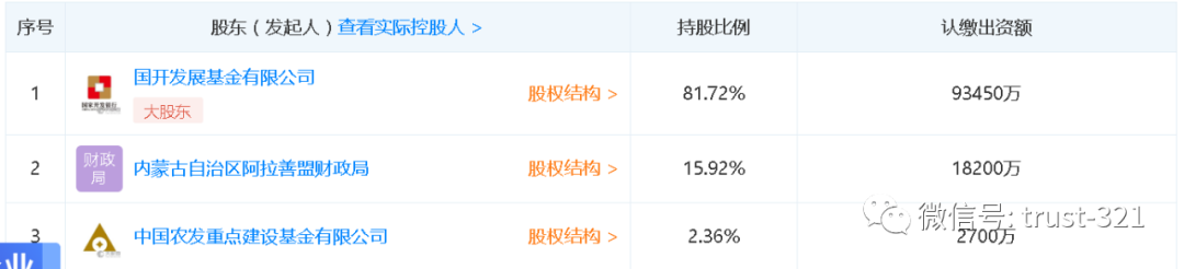 一次是2017年12月,股東由阿拉善盟財政局100%持股,變成了目前的三家持股,國開發(fā)展基金有限公司出資9.34億,成為第一大股東: