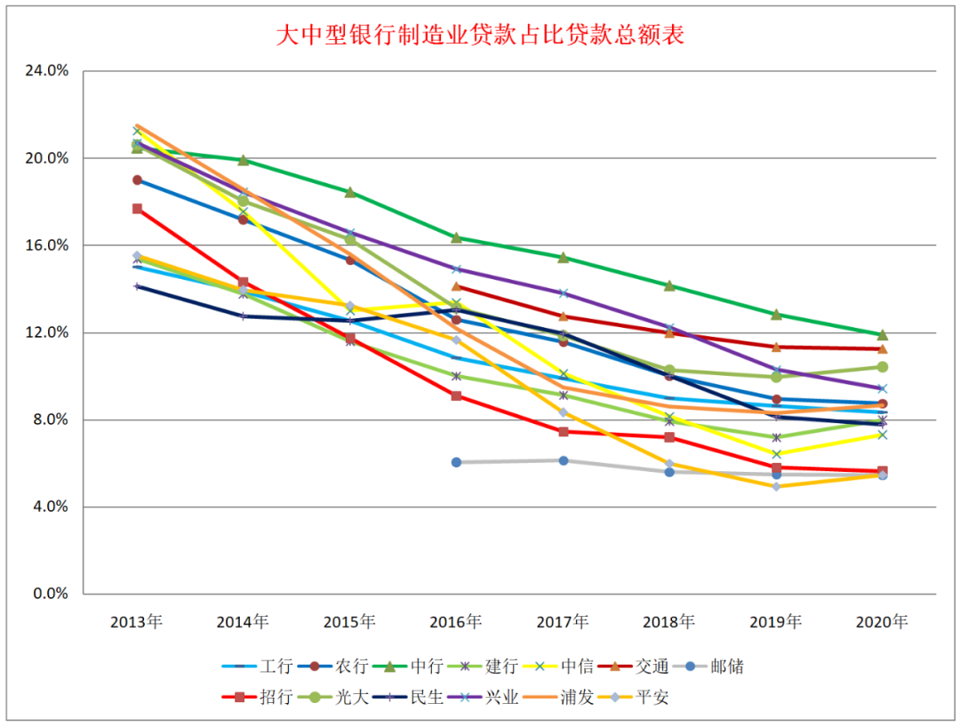 4、制造業貸款占比情況。中國的制造業是全球的王者,激烈的競爭也決定了很多企業生存非常艱難,集團企業平均壽命7年,中小企業平均壽命不到3年,能從銀行貸款的制造業企業按理并不差,但從歷年各家銀行的財報看,除掉核銷的不良,公布的不良率有不少接近10%甚至超過10%,憑這些年對數據的觀察,制造業貸款應該會有20%會是壞賬,也就是貸款出去1個億,應該有2000萬壞賬,幾個點的利息完全覆蓋不了不良,制造業高的企業需要多一份謹慎。制造業貸款從2013年占比18%壓縮到現在占比8%,這里面壓縮最堅決最快最早的是招商銀行,招商銀行2016年制造業貸款就壓縮到10%以下,其他銀行都在10%以上,那兩三年也是招商銀行不良集中爆發的時期,現在壓縮到只有5%。后來中信銀行也壓縮的非常猛,從21%壓縮到6%,結果行長被抓第一條理由就是壓縮制造業過猛。對于中國銀行,制造業一直占比比較高,但是中國銀行新生不良一直很低,在四大行也是最低的,多少還是有點存疑,工農建三家都是中規中矩慢慢的壓縮。