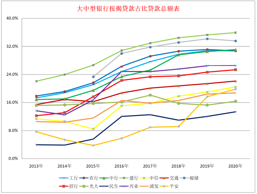 我們統計了13家大中型銀行過去八年貸款與總資產的占比、零售貸款與貸款總額的比值,制造業貸款與貸款總額的比值,批發零售業貸款與貸款總額的比值,按揭貸款與貸款總額的比值。