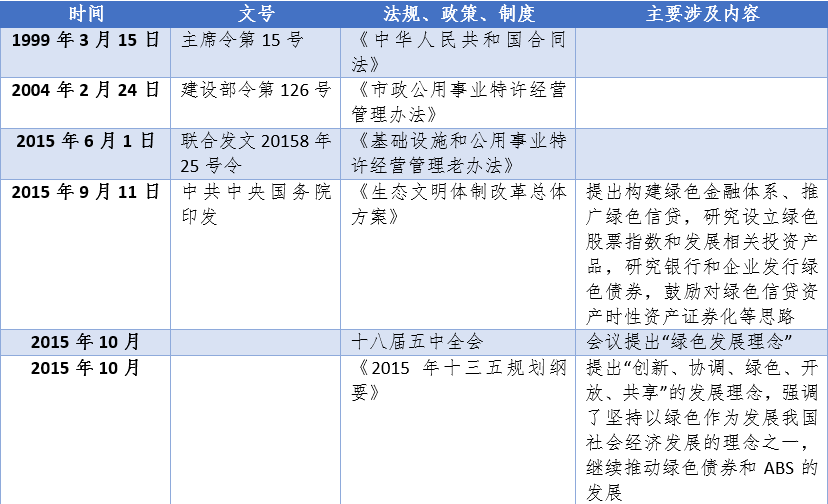 能源基礎(chǔ)設(shè)施是國家關(guān)注的重點項目,對如何可持續(xù)的發(fā)展能源基礎(chǔ)設(shè)施建議以匹配快速增長的能源消費和龐大的工業(yè)投資尤為重要。“一帶一路”戰(zhàn)略的提出以及城鎮(zhèn)加速化帶來的公共基礎(chǔ)設(shè)施共需壓力,促使經(jīng)濟(jì)發(fā)展對資金需求不斷增加,如何拓寬融資渠道、創(chuàng)新融資模式成為研究的新課題。為了更好的促進(jìn)能源基礎(chǔ)設(shè)施建設(shè),綠色金融應(yīng)運而生,我國政府在各個行業(yè)廣泛推廣PPP模式及合同能源管理等綠色金融模式,并出臺了一些列輔助這些金融模式工作開展的文件與通知。