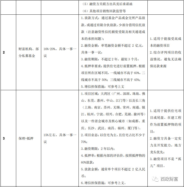 目前市面上能操作中小開發(fā)商融資業(yè)務(wù)的資金機(jī)構(gòu),除了前文提到的一些依托于開發(fā)商背景的資金機(jī)構(gòu)及大型的地產(chǎn)投資機(jī)構(gòu)外,還包括一些小貸機(jī)構(gòu)、三方財富公司及少部分私募基金、個人金主、少部分國央企背景的資金及資產(chǎn)管理機(jī)構(gòu)(非金不良模式)。其中小貸機(jī)構(gòu)的成本一般集中在年化16%-18%,三方財富公司及少部分私募基金因其資金受限于資金募集(當(dāng)前產(chǎn)品形式受限、私募等機(jī)構(gòu)頻繁爆雷增加了募集難度),其成本一般在年化18%-20%左右,個人金主的融資成本相對更高一些,但該類資金往往可以接受項目下沉到三四線城市。另外,依托于開發(fā)商背景的資金機(jī)構(gòu)、大型的地產(chǎn)投資機(jī)構(gòu)以及少部分國央企、資產(chǎn)管理機(jī)構(gòu)因為其資金主要是自有資金,其融資成本則相對低一些,普遍在年化15%左右,當(dāng)然對于優(yōu)質(zhì)的主體并提供前置抵押的情況下,融資成本可到年化12%-13%,或者更低。