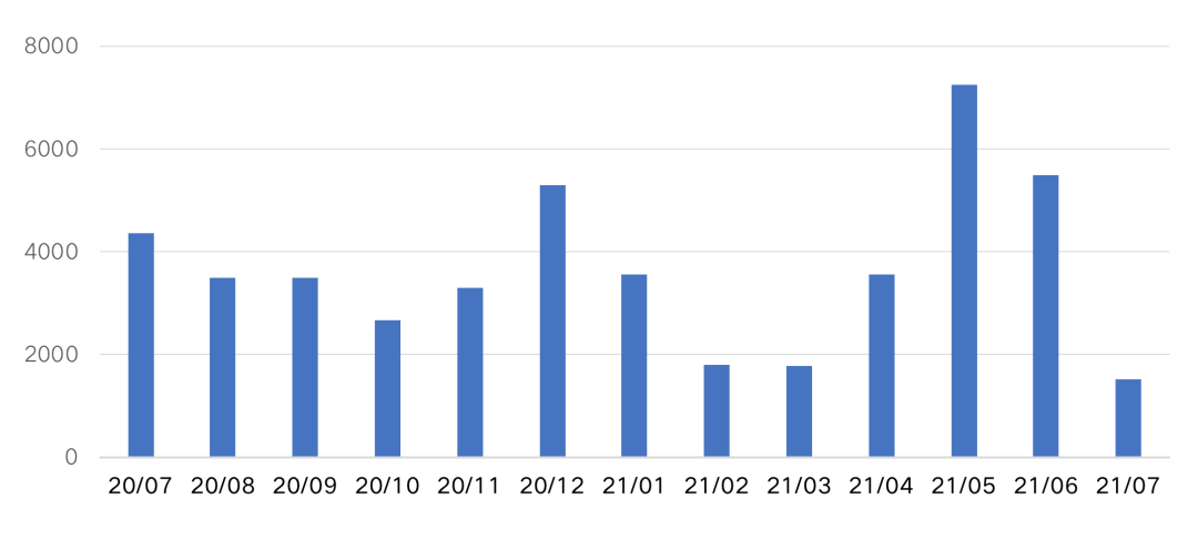 圖:2017-2021年7月房企拿地投資規模(億元)