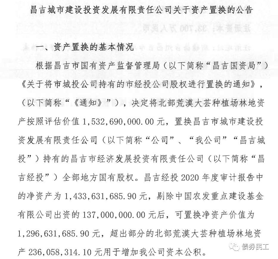 1、根據(jù)昌吉城市建設(shè)投資發(fā)展有限責(zé)任公司2021年9月23日發(fā)布的公告,擬將北部荒漠大蕓種植場(chǎng)林地資產(chǎn)用于置換公司的全資子公司昌吉市經(jīng)濟(jì)發(fā)展投資有限責(zé)任公司的股權(quán)。根據(jù)公告內(nèi)容,本次資產(chǎn)置換的主要目的是深化昌吉市的國(guó)有企業(yè)改革,調(diào)整優(yōu)化國(guó)有資本布局。公司的控股股東是昌吉市國(guó)有資產(chǎn)投資經(jīng)營(yíng)有限責(zé)任公司,實(shí)際控制人是昌吉市國(guó)有資產(chǎn)監(jiān)督管理局。公司的主體信用評(píng)級(jí)為AA,存續(xù)債券金額為14.80億元。