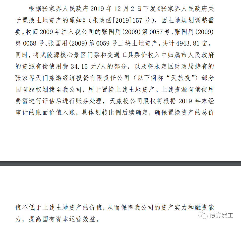 4、根據(jù)張家界市經(jīng)濟(jì)發(fā)展投資集團(tuán)有限公司于2020年6月9日發(fā)布的公告,將部分門票和交通工具收入、國(guó)有企業(yè)股權(quán)劃入公司,同時(shí)將三塊土地資產(chǎn)劃出,實(shí)現(xiàn)國(guó)有企業(yè)資產(chǎn)置換。公司的控股股東是和實(shí)際控制人是張家界市國(guó)資委。公司的主體信用評(píng)級(jí)為AA(中證鵬元和聯(lián)合資信),存續(xù)債券8只,存續(xù)債券金額為69.10億元。