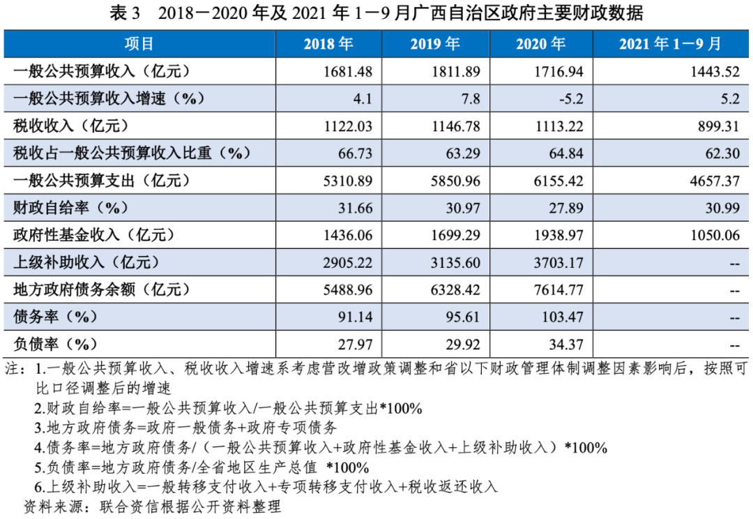 廣西壯族自治區擁有豐富的自然資源,近年來經濟持續增長,經濟總量處于全國中下游水平,人均GDP排名靠后;受新冠疫情影響,2020年廣西經濟增速及固定資產投資增速均明顯放緩;廣西自治區政府一般公共預算收入有所下降,財政自給率較弱,上級補助對自治區政府綜合財力提供了有力支撐。廣西自治區政府負債率及政府債務率在全國排名中下游,地方政府債務規模持續增長,但債務負擔相對較輕,償債能力一般。