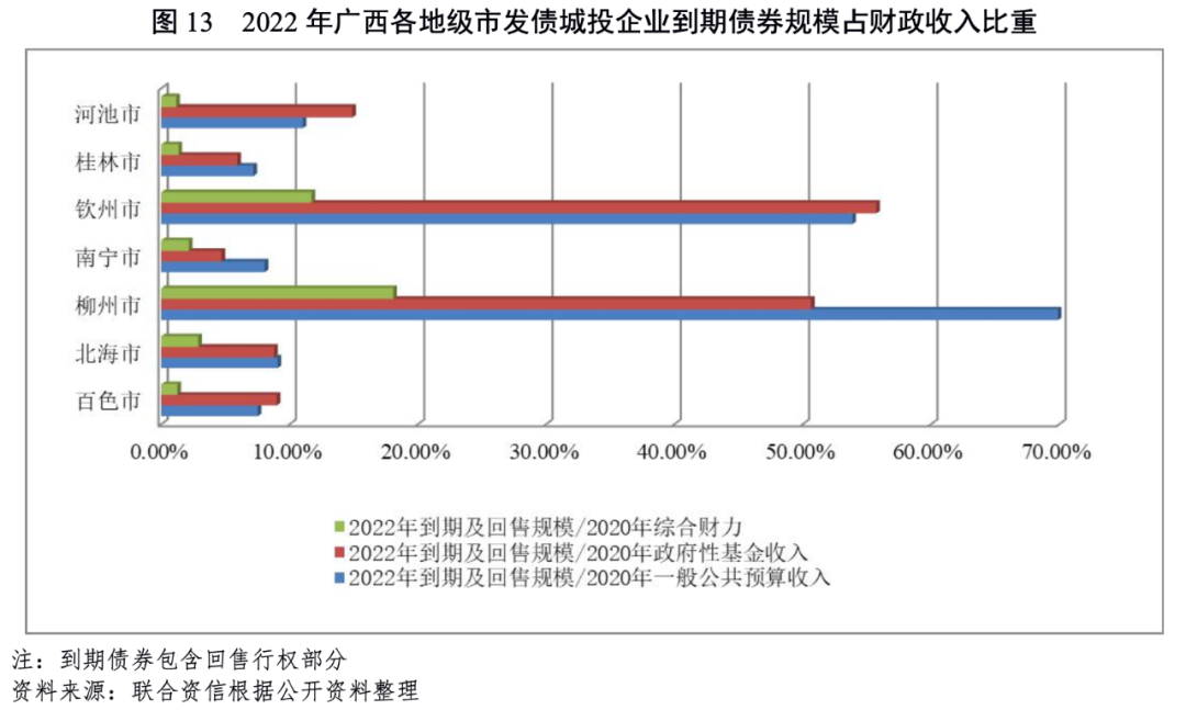 廣西發債城投以地級市城投企業為主,區縣城投企業較少,柳州市為廣西發行城投債最多的地區。各地級市城投企業融資能力分化明顯,北海市和來賓市城投企業凈融資額為負。柳州市及欽州市短期償債能力指標較弱,償債壓力持續加大。柳州市城投企業未來三年到期債券規模較大,存在較大的集中兌付壓力。廣西超半數地級市的“發債城投企業全部債務+地方政府債務”/綜合財力超過100%,財政收入對“發債城投企業全部債務+地方政府債務”覆蓋程度低。
