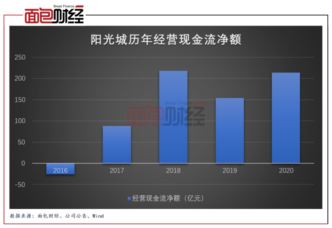 現(xiàn)金流方面,陽(yáng)光城2020年產(chǎn)生經(jīng)營(yíng)性?xún)衄F(xiàn)金流入213.54億元,相比2019年的153.96億元明顯增加。截至2020年末,公司賬面擁有貨幣資金498.05億元。