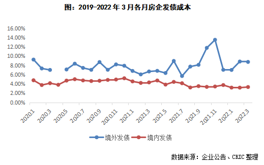2022年3月100家典型房企新增債券類融資成本4.35%,環(huán)比上升0.54pct,同比下降0.62pct。其中境內(nèi)融資成本3.30%,環(huán)比上升0.13pct,本月有更多的企業(yè)進(jìn)行了境內(nèi)發(fā)債,上實(shí)城市開發(fā)、首開股份、金融街、旭輝集團(tuán)等加入了發(fā)債隊(duì)伍;境外融資成本8.72%,環(huán)比下降0.09pct。2021年截至3月100家典型房企新增債券類融資成本4.50%,較2021年下降0.78個百分點(diǎn),其中境外債券融資成本達(dá)7.54%,上升0.52個百分點(diǎn),境內(nèi)債券融資成本3.23%,較2021年下降0.83個百分點(diǎn)。