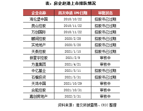 本月廣東房企嘉創(chuàng)房地產(chǎn)首次向港交所遞交招股說明書,新星宇控股則在3月17日再次更新了招股書,因此截至2022年3月底,在港交所在遞交過招股書但仍未成功上市的房企為13家,其中有8家房企在招股書過期后都沒有更新招股書,未來是否會繼續(xù)上市進(jìn)程還有待觀察。