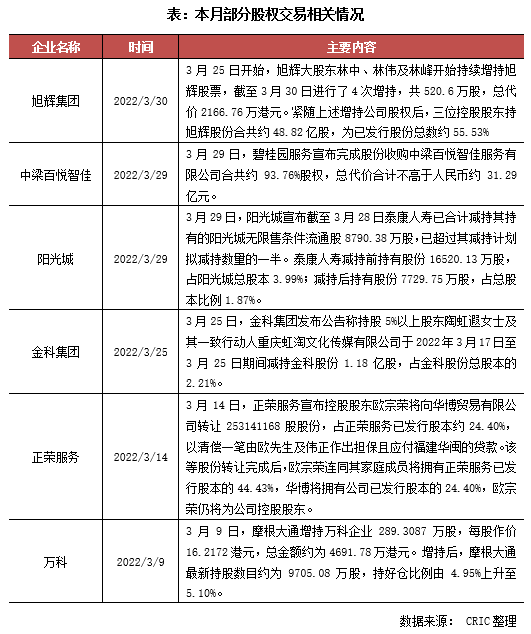 本月有多家大型房企出現(xiàn)了股權(quán)變動,包括旭輝大股東在25日之后對公司股份的連續(xù)增持,陽光城股東泰康人壽繼續(xù)減持計劃,以及摩根大通對萬科的增持等。除此之外比較值得注意的是物管企業(yè)股權(quán)的變動:碧桂園服務(wù)完成了對中梁旗下物業(yè)公司中梁百悅智佳93.76%股權(quán)的收購,總代價不超過31.29億元;正榮服務(wù)大股東為了清償貸款將公司24.40%的股權(quán)轉(zhuǎn)讓給華博貿(mào)易。整體看來,本月由于部分房企流動性問題的影響,物管行業(yè)出現(xiàn)了一定的收并購機(jī)會,因此碧桂園服務(wù)這樣的龍頭物企仍在繼續(xù)出手進(jìn)行收并購,同時部分房企也有以旗下物業(yè)股權(quán)清償負(fù)債的舉動。