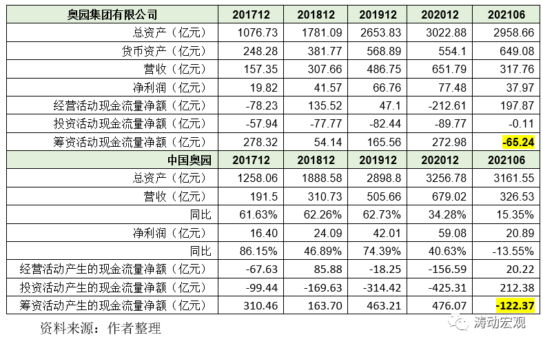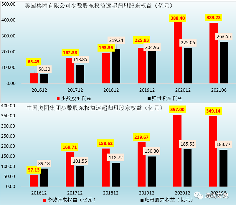 1、中國奧園是奧園系的源頭,而奧園集團則是中國奧園的絕對核心,其各項經營指標貢獻了中國奧園的95%左右。截至2021年6月底,中國奧園的總資產達到3161.55億元(奧園集團貢獻94%左右)、今年上半年分別實現營收和凈利潤326.53億元和17.40億元,而對應奧園集團分別實現營收和凈利潤317.76億元和37.97億元,優于中國奧園。可以看出,今年上半年中國奧園貢獻的凈利潤遠小于其全資子公司奧園集團,甚至還不到奧園集團的一半,著實奇怪。