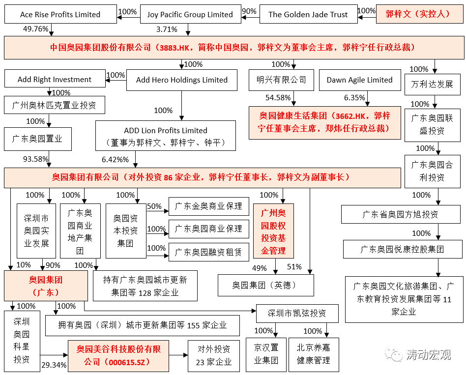 奧園系以郭氏家族為核心,兩大發債企業、三家上市公司為主體,同時還擁有商業保理、融資租賃以及私募基金等類金融機構。