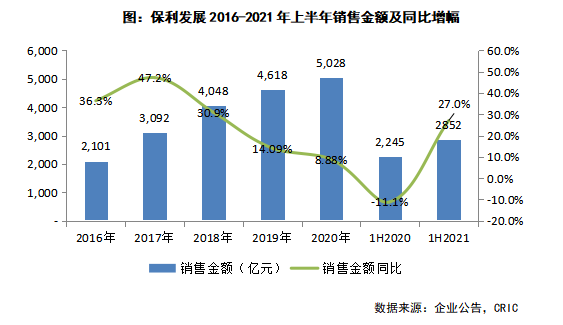 從銷售區域分布來看,2021年上半年保利發展銷售面積貢獻最大的區域為珠三角區域,占比達到32.7%,同比減少1.9各百分點;此外中西部區域銷售面積同比增長2.4各百分點至25.6%,增幅最大。