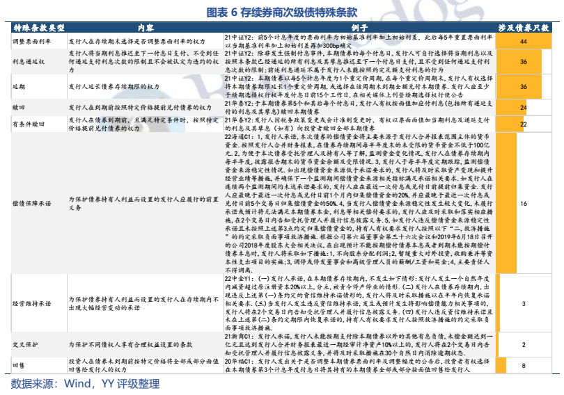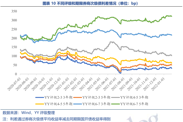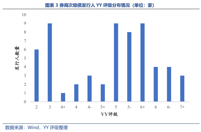 目前現(xiàn)存券商次級債多為可用于補充附屬凈資本的長期次級債,YY評級在2-3以及5-6+的頭部和腰部券商為發(fā)行主力,發(fā)行人資質(zhì)整體較優(yōu)。相對于銀行二級資本來說,券商次級債條款設置較為友好,目前存續(xù)債均未附減記條款且永續(xù)次級債尚無延期情況出現(xiàn)。收益率分級別來看,頭部和尾部近年分化加大,利差已擴大至200bp。