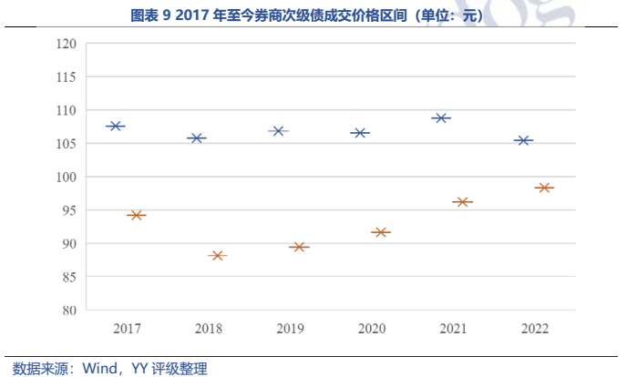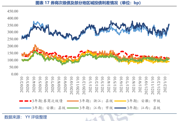供需格局方面,券商作為重要金融資源之一,多為央企或地方政府實控,承擔著擴容資本市場和提高直接融資比重的使命;歷史來看,監(jiān)管對以往違規(guī)操作和風險暴露券商的處置落地整體較為穩(wěn)妥且以警示為主,券商持續(xù)經(jīng)營假設較為成立。因此,作為唯一可用于補充凈資本的債券,券商次級債供給規(guī)模預計將維持較高水平;而主體的持續(xù)經(jīng)營假設也賦予了其債券產(chǎn)品較厚的安全邊際,高于中部市級城投和浙江縣級城投的收益率也帶來一定性價比優(yōu)勢,預計后續(xù)配置熱情也將持續(xù)。