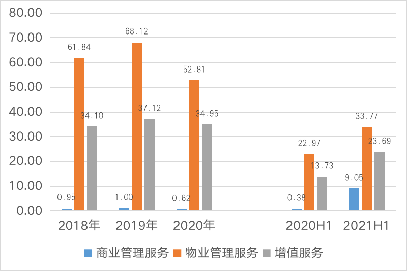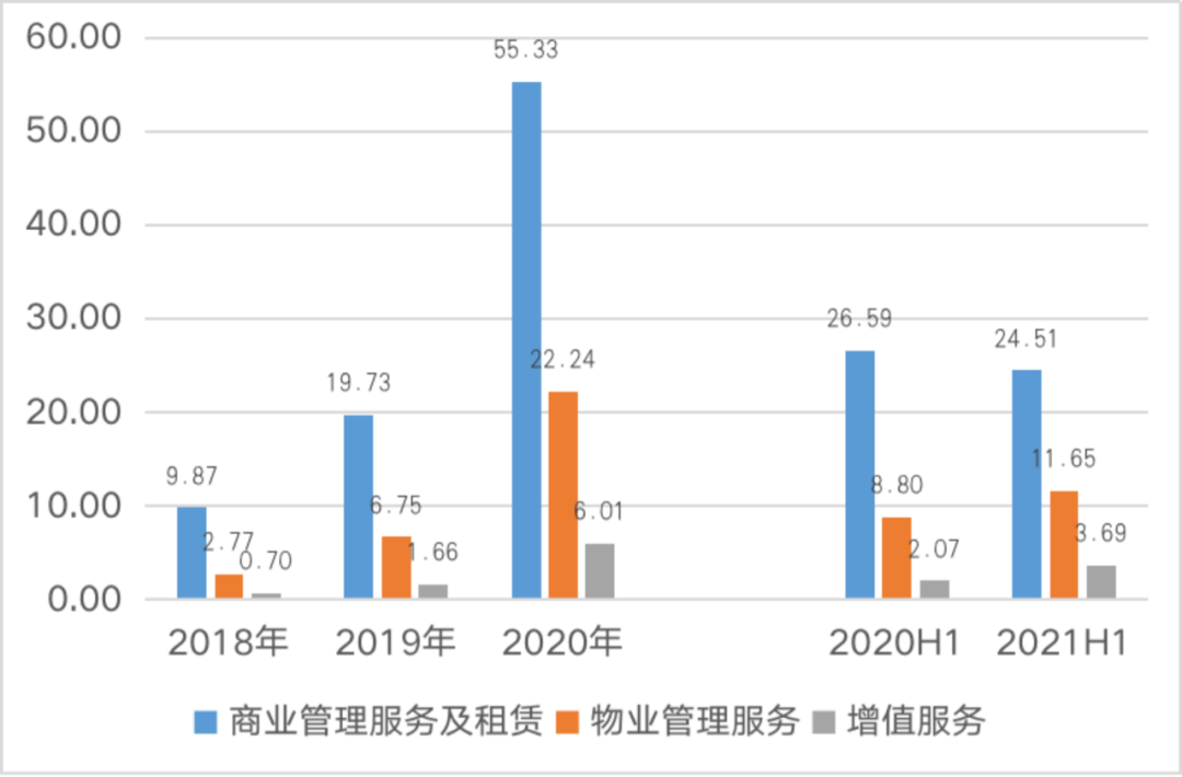 在委托管理模式之下,物業(yè)管理服務(wù)一直為主要營(yíng)收來(lái)源,收入占比均達(dá)到50%以上,而商業(yè)管理服務(wù)在2021年上半年由不足1億元的營(yíng)收水平猛增至9.05億元,主要是因?yàn)?018年至2020年,委托管理模式下萬(wàn)達(dá)商管并未對(duì)運(yùn)營(yíng)管理服務(wù)收取費(fèi)用,僅對(duì)開(kāi)業(yè)前的咨詢服務(wù)進(jìn)行收費(fèi),因此營(yíng)收較低,自2021年5月開(kāi)始對(duì)運(yùn)營(yíng)管理收取服務(wù)費(fèi)以致該部分營(yíng)收猛增。