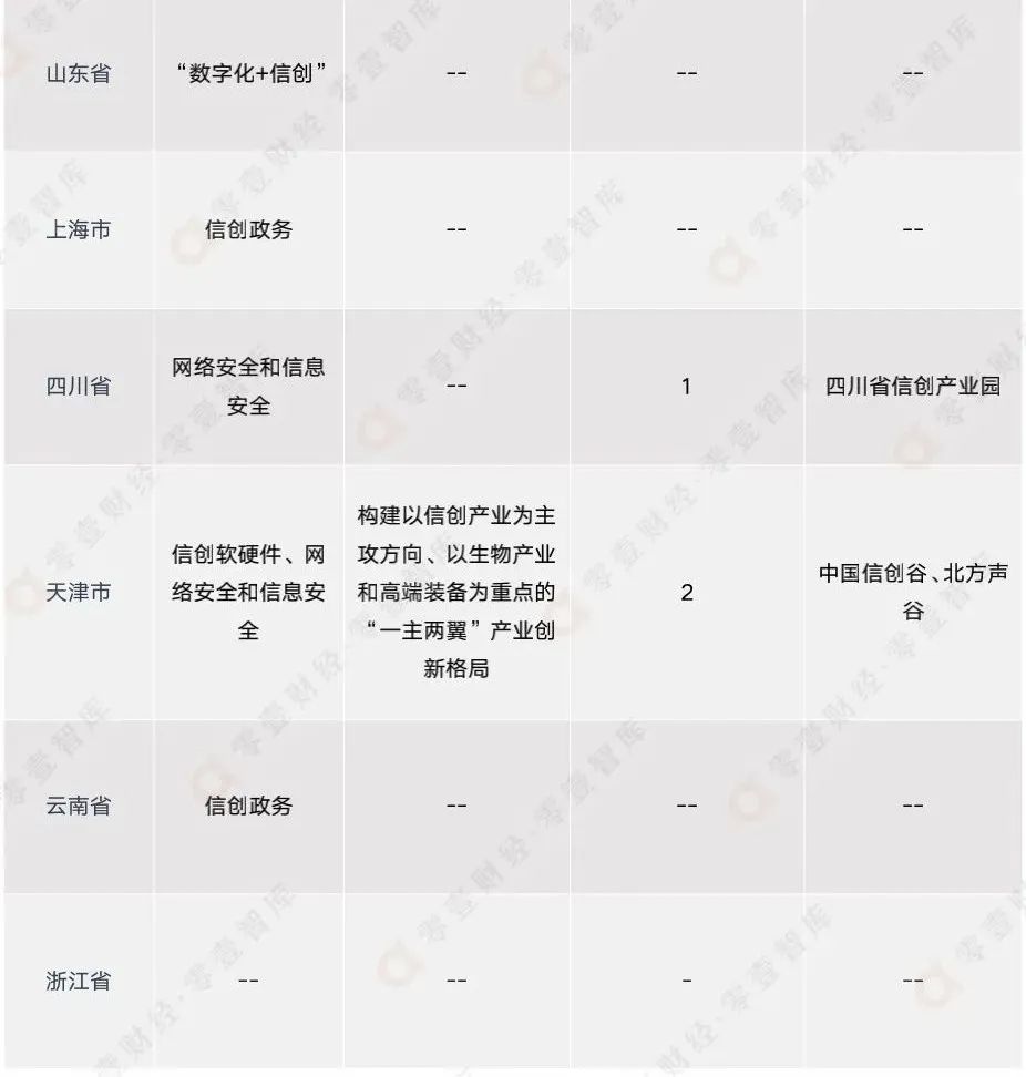 隨著信創發展到了一定階段,各地政府對當地信創產業發展要求以及路線不可避免地發生了改變。根據各地方政府近兩年來發布的最新的信創相關政策文件可以看出,以浙江省、北京市、四川省為代表的省級行政區因地制宜,明確提出在當地建設信創基地,依托當地企業、科研院所等優勢,在當地建立信創生態,避免在信創發展中后期可能存在的受制于人的情況。以天津市、山東省、安徽省為代表的省級行政區則加速發展信創硬軟件,推進信創、人工智能、5G+等多熱門領域協同發展發展,力求在信息技術領域全方面、立體化發展。