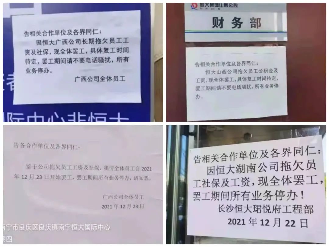 但是好兆頭并沒有能夠溢到城市的項目上。同一天,長沙恒大珺悅府工程部、恒大廣西公司、恒大山西公司相繼發(fā)布通知稱,因所在公司拖欠員工公積金及工資,現(xiàn)全體罷工,罷工期間所有業(yè)務停辦,具體復工時間待定。