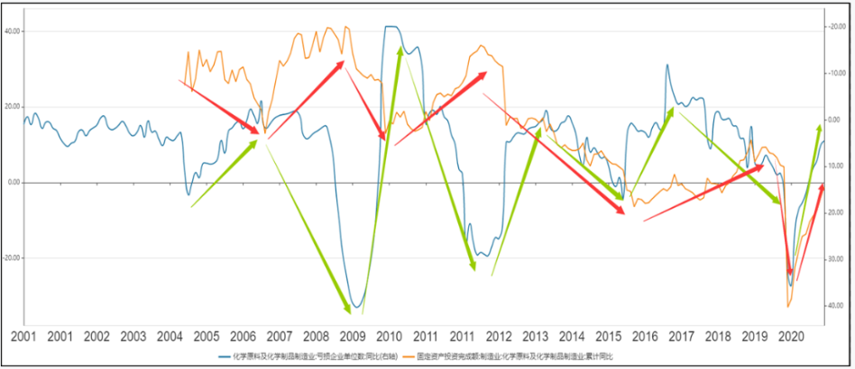 可以簡單梳理其中邏輯:國內化工行業(yè)以中低端基礎化工為主,行業(yè)產(chǎn)能相對過剩,因此資本的進入很容易加劇行業(yè)競爭進而影響行業(yè)景氣度。具體表現(xiàn)為,迅速增加的供給能力無法與市場需求匹配,導致行業(yè)階段性過剩,企業(yè)盈利能力隨之下降,虧損企業(yè)數(shù)量增加,同時,預示著行業(yè)景氣度下行。而行業(yè)景氣的下行會逐漸打消潛在資本的進入欲望,直至行業(yè)景氣度的低谷,資本對行業(yè)的投入便不再增加并在之后逐步減少。隨著市場需求增長,市場逐步消化既有產(chǎn)能,供需關系逐步改善,行業(yè)景氣度從低谷上行。