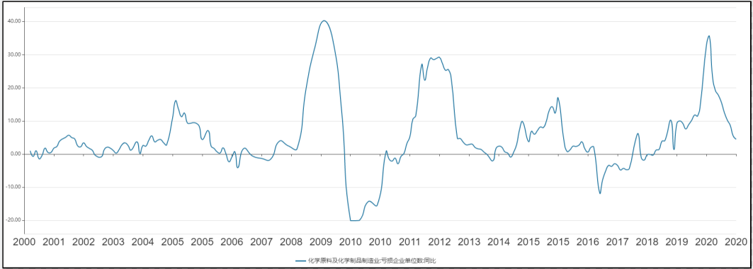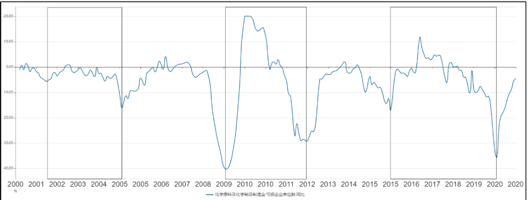經(jīng)過對多年數(shù)據(jù)分析,雖然每家化工企業(yè)經(jīng)營情況各有不同,但在相對充分市場化競爭的格局下,徘徊在盈虧邊緣化企的變化更能敏感的反映行業(yè)景氣度變動,因此,我們可以用化工行業(yè)虧損企業(yè)家數(shù)同比的變化較為直觀的反映行業(yè)的興衰。我們通過對國家統(tǒng)計局公布的近二十年化學原料及化學制造業(yè)虧損企業(yè)家數(shù)同比數(shù)據(jù)進行整理,繪制出圖1。在圖中可以清晰的看出近二十年國內化工企業(yè)虧損數(shù)量在不同時期波動差異較大,同時,也反映出我國化工行業(yè)近二十年行業(yè)景氣度大幅波動的現(xiàn)狀。
