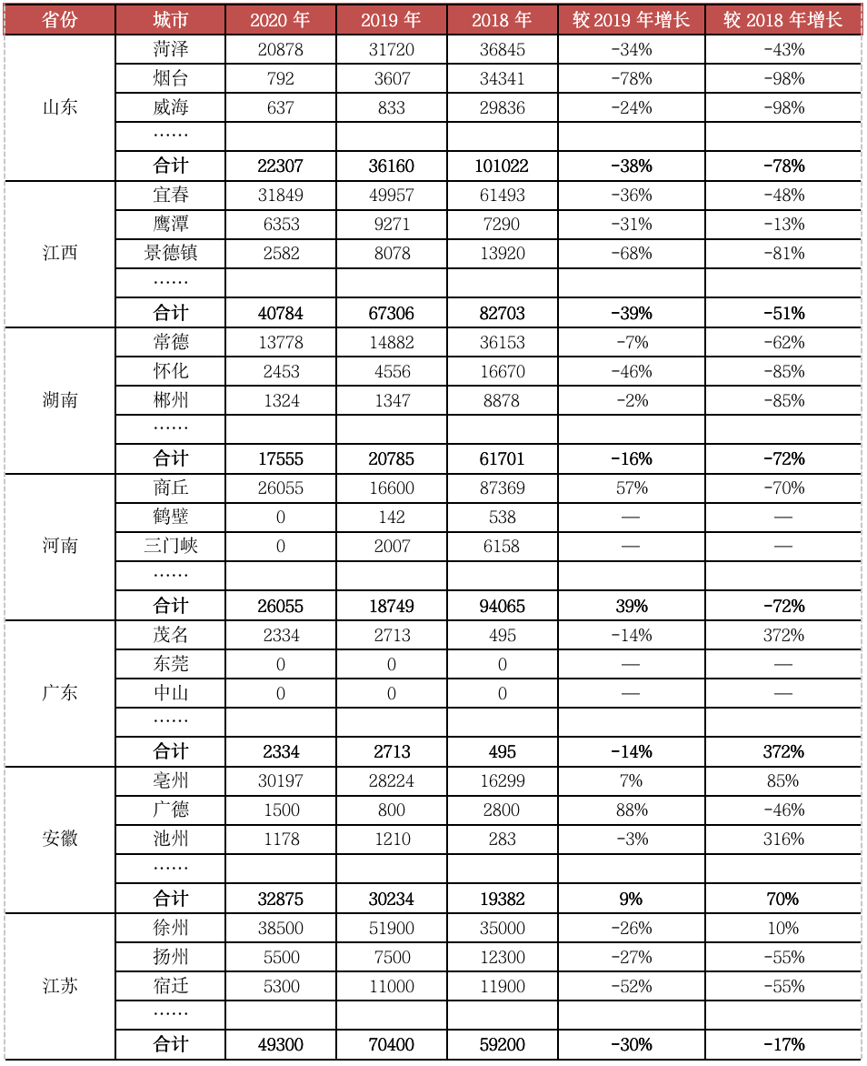 傳統棚改大省山東、河南、新疆等計劃開工量更是顯著縮量。以全國棚改第一大省山東為例,計劃開工量由2018年67.2萬套持續下滑至2020年14.3萬套,累計降幅多達79%,棚改市場規模顯著縮量。