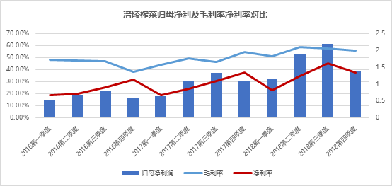 涪陵榨菜的提價(jià)對(duì)毛利率和凈利率貢獻(xiàn)是巨大的。主要也體現(xiàn)在四季度上,毛利率同比增長(zhǎng)16.43%,首次突破50%,達(dá)54.34%,創(chuàng)出階段歷史新高。