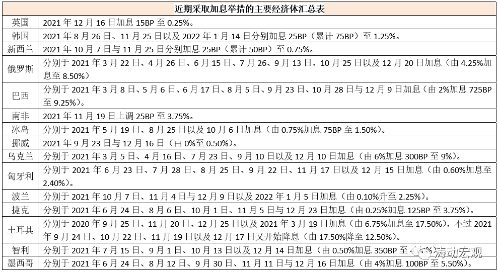 站在當(dāng)前來看,和上一輪美聯(lián)儲(chǔ)政策收緊過程相比,本輪最大的差異在于國(guó)內(nèi)貨幣政策的自主性以及監(jiān)管政策的高壓性更為突出,同時(shí)中國(guó)也在匯率方面也有更大的操作彈性和容忍度、通脹對(duì)貨幣政策的制約力度明顯下降等。這意味著,當(dāng)美聯(lián)儲(chǔ)Taper進(jìn)程加快、加息與縮表步伐提前時(shí),中國(guó)政策松一松的窗口期實(shí)際上是變得更短了,也更緊迫了。畢竟在美聯(lián)儲(chǔ)Taper加快的這段時(shí)期,中國(guó)經(jīng)濟(jì)又出現(xiàn)了新的下行壓力,穩(wěn)增長(zhǎng)壓力正變得越來越突出,中國(guó)需要在美聯(lián)儲(chǔ)正式加息之前呵護(hù)好國(guó)內(nèi)經(jīng)濟(jì)基本面。特別是我們看到,2021年11月以來,已有英國(guó)、韓國(guó)、新西蘭、巴西、南非、烏克蘭、匈牙利、波蘭、捷克、智利和墨西哥等經(jīng)濟(jì)選擇加息,既包括發(fā)展中國(guó)家,也包括韓國(guó)和新西蘭等發(fā)達(dá)經(jīng)濟(jì)體。