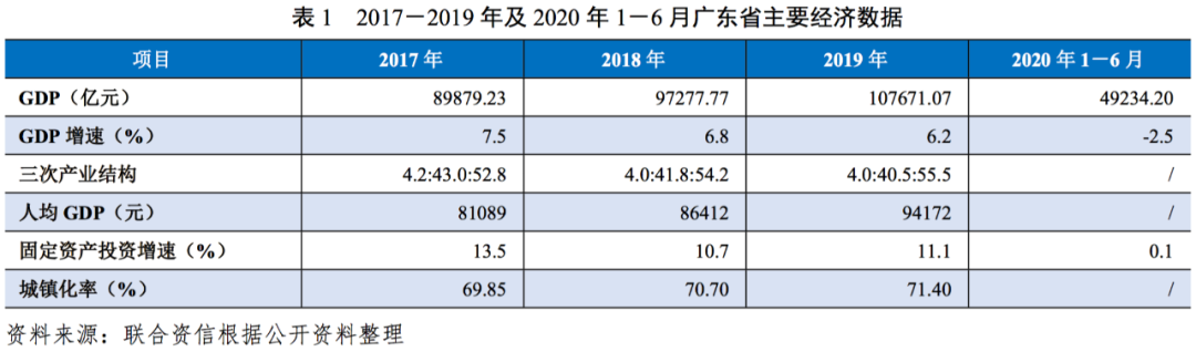 廣東省地處中國南部,是中國開放程度最高、經濟活力最強的區域之一。近三十年來,廣東省經濟總量均位于中國首位,人均GDP處于中國領先水平,但近三年經濟增速有所放緩;同時,廣東省也獲得了國家層面區域經濟發展政策的有力支持,經濟發展態勢良好。2020年上半年,受新冠肺炎疫情影響,廣東省經濟增速及固定資產投資規模增速等明顯下滑。