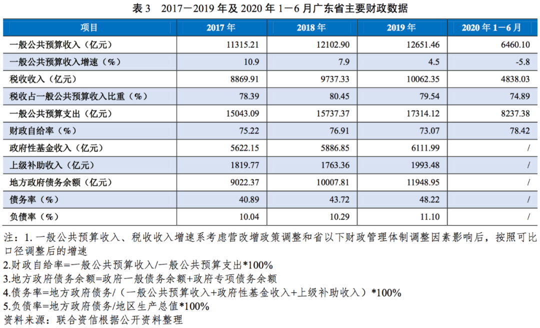 廣東省是中國開放程度最高、經濟活力最強的區域之一,經濟總量長期位居中國第一,人均GDP在中國名列前茅,受國家經濟發展政策支持力度大,經濟發展態勢良好。2019年,廣東省財政收入排名中國第一,且大幅領先其他省市,一般公共預算收入穩定性強,財政自給程度較高,整體財政實力很強。2019年廣東省政府負債率為11.10%,與其他省市相比,政府債務負擔很輕;廣東省政府債務率為57.60%,償債能力很強。